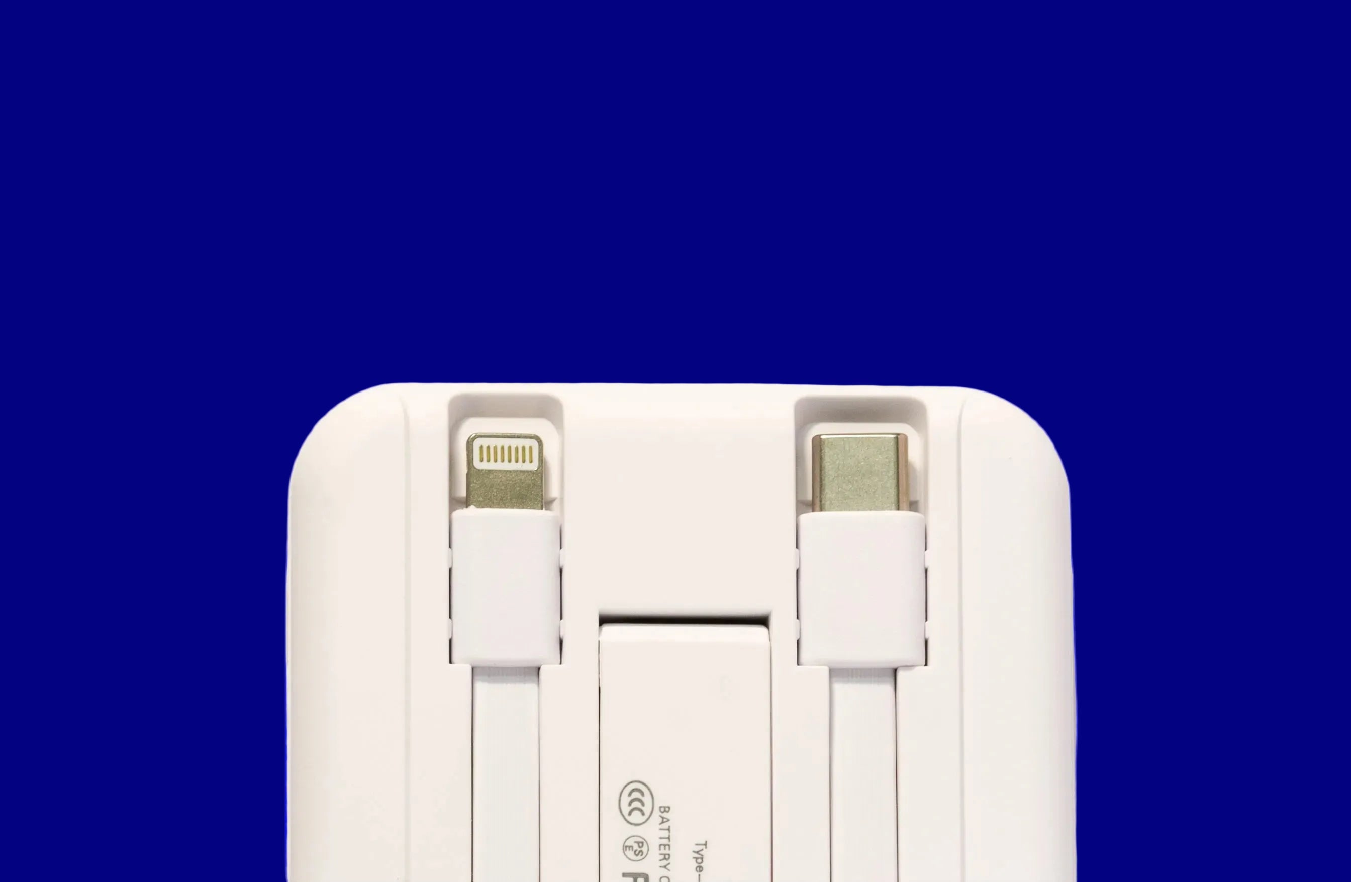 Cavalletto integrato per la ricarica orizzontale. Due cavi fissi (USB-C e Lightning) per dispositivi non magnetici. Compatto e elegante.